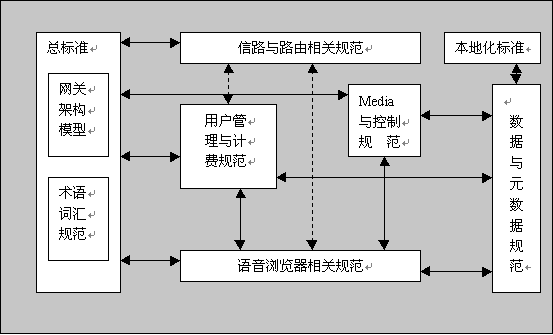 通過分析國際上各種語音網(wǎng)關(guān)系統(tǒng)極其技術(shù)規(guī)范,特別是參照 W3C組織的"Voice Browser" Activity的框架,我們認(rèn)為作為一個比較完整的語音網(wǎng)關(guān)標(biāo)準(zhǔn)體系,應(yīng)該包含以下具體標(biāo)準(zhǔn)規(guī)范的制定,通常稱之為標(biāo)準(zhǔn)需求。下圖顯示所需的規(guī)范類型及其相互關(guān)聯(lián)。