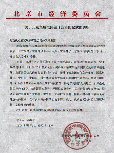 首屆呼叫中心運(yùn)營(yíng)管理研討會(huì)組委會(huì) 重要通告 本次大會(huì)組委會(huì)及會(huì)議舉辦地點(diǎn)“天鴻科園大酒店”日前接到北京市人民政府通知,由于“北京集成電路設(shè)計(jì)園開園儀式”將于2002年4月18日至4月20日在大運(yùn)村、天鴻科園大酒店舉行開園儀式及相關(guān)活動(dòng),屆時(shí)將有北京市劉淇市長(zhǎng)、海燕市長(zhǎng)及國家信息產(chǎn)業(yè)部、國家科技部、中科院、中國電子科技集團(tuán)等有關(guān)部委和機(jī)構(gòu)的主要領(lǐng)導(dǎo)出席。按市領(lǐng)導(dǎo)指示,為配合此次重大活動(dòng)圓滿舉行,“首屆呼叫中心運(yùn)營(yíng)管理研討會(huì)”日期更改為2002年4月23日至4月25日在北京天鴻科園大酒店舉行,望有關(guān)參會(huì)單位做好相應(yīng)的后續(xù)工作。特此通告! 組委會(huì)對(duì)有關(guān)參會(huì)單位的支持與配合表示真誠的感謝。 首屆呼叫中心運(yùn)營(yíng)管理研討會(huì)組委會(huì)