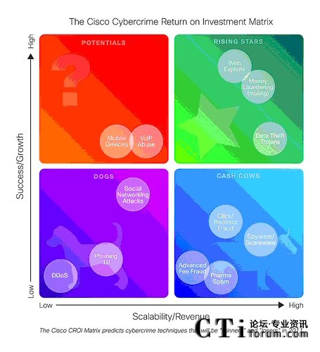 通過(guò)思科CROI矩陣對(duì)網(wǎng)絡(luò)犯罪類(lèi)型的分析,思科安全專(zhuān)家預(yù)測(cè):在2011年,以獲得非法利益為目的的網(wǎng)絡(luò)犯罪將會(huì)分流他們的資源。