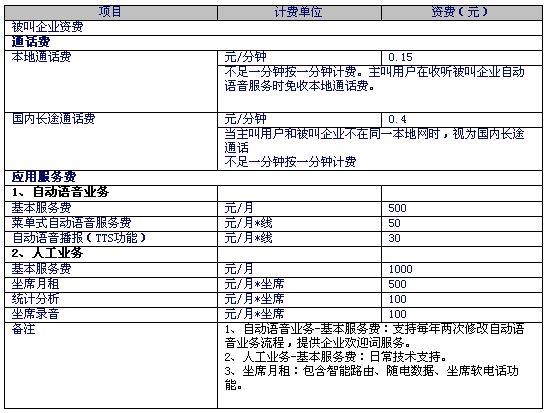 2、被叫企業(yè)資費標(biāo)準(zhǔn)如下: