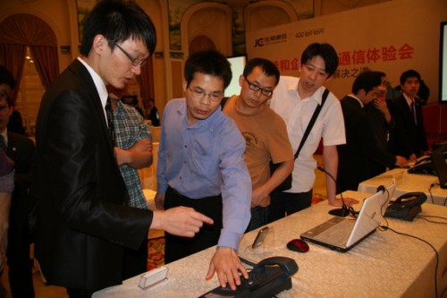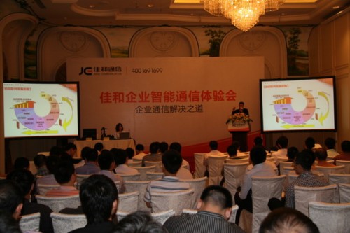 CTI論壇(ctiforum)4月25日消息(記者 潘婷婷): 廣東佳和通信技術(shù)有限公司主辦的首場(chǎng)企業(yè)智能通信體驗(yàn)會(huì),于2011年4月13日在廣州富力麗思卡爾頓酒店隆重召開,并取得圓滿成功。此次體驗(yàn)會(huì)來(lái)自佳和通信的負(fù)責(zé)人和業(yè)內(nèi)專家就佳和企業(yè)智能通信平臺(tái)的應(yīng)用以及協(xié)同辦公的發(fā)展趨勢(shì)發(fā)表了主題演講,為所有到場(chǎng)的100多位來(lái)賓做了詳實(shí)的介紹。同時(shí)展示了佳和“!毕盗械7個(gè)應(yīng)用解決方案,并對(duì)拳頭產(chǎn)品——智能IP話機(jī)T600、移動(dòng)分機(jī)M600、個(gè)人助理軟件IPA PRO等進(jìn)行了現(xiàn)場(chǎng)演示和互動(dòng),其目的在于使現(xiàn)場(chǎng)嘉賓充分感受企業(yè)智能通信的價(jià)值和魅力,同時(shí)親身體驗(yàn)到如何在在加速辦公自動(dòng)化的同時(shí)提高企業(yè)效率、節(jié)約成本。