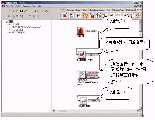 速能呼叫中心中間件的IVR流程開發(fā)接口簡單易學(xué),編寫人員并不需要了解底層的實現(xiàn)原理、Dialogic硬件等知識,而將精力完全放在業(yè)務(wù)開發(fā)上即可。