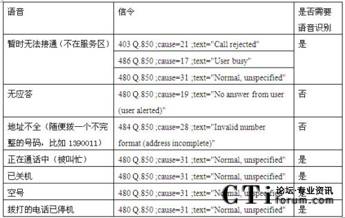 從歸納的情況看,只有無應(yīng)答和地址不全兩種情況是可靠信令分析來識別的,其他的5種情況都無法通過信令檢測識別。特別是暫時(shí)無法接通的語言提示,播放完提示音有3種不同的信令,應(yīng)該是屬于不同的情況,但是放了相同的語音。因此造成號碼識別錯(cuò)誤的現(xiàn)象。
