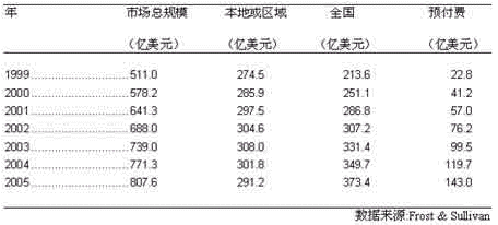 本地或區(qū)域價(jià)格方案在我們預(yù)測(cè)的時(shí)期內(nèi), 將始終是手機(jī)用戶采納的最多的一種方案。 1999年,在美國(guó)有5千7百 萬(wàn),大約70%的用戶是采用本地或區(qū)域方案, 而該方案產(chǎn)生的營(yíng)業(yè)額為274.5億美元, 約占市場(chǎng)總規(guī)模的58.6%。Frost & Sullivan 預(yù)計(jì),到2005年, 46.6%的手機(jī)用戶還會(huì)使用該種方案, 而該方案產(chǎn)生的營(yíng)業(yè)額將為291.2億美元,占市場(chǎng)總規(guī)模的比例將縮至36.1%。