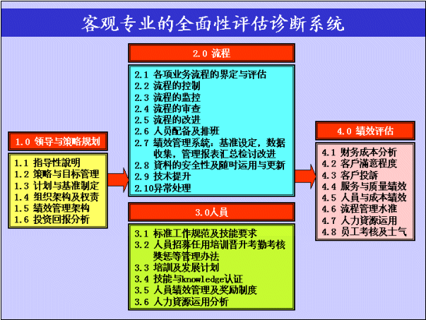 此評估診斷系統(tǒng)以1.0領(lǐng)導(dǎo)與決策規(guī)劃為起始點(diǎn),作為建立一個(gè)以客戶為核心的高質(zhì)量客戶服務(wù)中心的推動根源,并且制定了一個(gè)良好的4.0績效評估系統(tǒng),以確保經(jīng)營目標(biāo)與標(biāo)準(zhǔn)質(zhì)量基準(zhǔn)能確實(shí)達(dá)成,此過程需透過嚴(yán)謹(jǐn)?shù)牧鞒淘O(shè)計(jì)和高效的人員管理去執(zhí)行這套運(yùn)營體系。