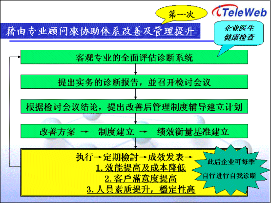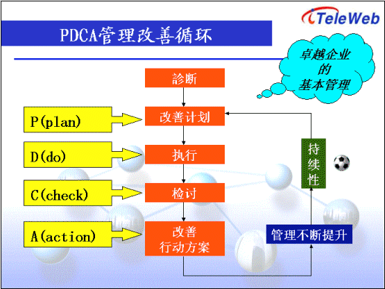 2) PDCA的流程,即診斷、改善計(jì)劃、執(zhí)行、檢討以及改善行動方案等。