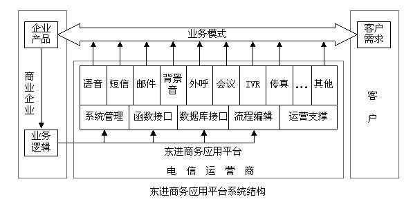 東進商務(wù)應(yīng)用平臺融合了電信運營商、企業(yè)的多種業(yè)務(wù)模式,平臺在開放、標(biāo)準(zhǔn)的系統(tǒng)架構(gòu)下,集成了統(tǒng)一的業(yè)務(wù)使用環(huán)境、統(tǒng)一的業(yè)務(wù)應(yīng)用服務(wù)器、統(tǒng)一的數(shù)據(jù)業(yè)務(wù)、統(tǒng)一的業(yè)務(wù)開放接口和統(tǒng)一的二次開發(fā)平臺,將語音、短信、IVR、電子郵件、傳真、外呼、會議、背景音效等業(yè)務(wù)手段靈活地嵌入到企業(yè)的業(yè)務(wù)流程和業(yè)務(wù)邏輯中,同時還能利用東進應(yīng)用函數(shù)接口、數(shù)據(jù)庫接口、流程編輯器等進行二次開發(fā),方便、快捷地添加新業(yè)務(wù),系統(tǒng)遵循了以業(yè)務(wù)為導(dǎo)向,以客戶為導(dǎo)向的企業(yè)經(jīng)營模式,滿足了企業(yè)豐富多彩和快速多變的商務(wù)應(yīng)用需求。