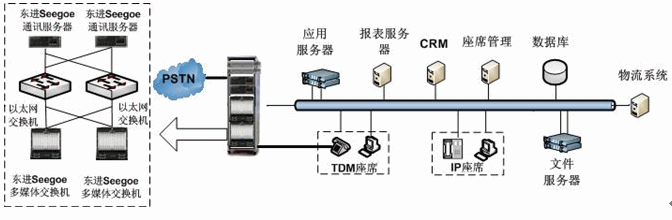 東進(jìn)技術(shù)電視購(gòu)物呼叫中心解決方案,采用東進(jìn)技術(shù)Seegoe系列多媒體交換機(jī)和多媒體服務(wù)器搭建系統(tǒng)平臺(tái)。東進(jìn)Seegoe系列多媒體交換機(jī),具有豐富的媒體資源和強(qiáng)大的處理能力,并提供功能模塊的N+1全冗余備份,滿(mǎn)足了高負(fù)荷、大并發(fā)和關(guān)鍵業(yè)務(wù)的可靠運(yùn)營(yíng)。以Seegoe多媒體交換機(jī)、Seegoe通訊服務(wù)器為核心的面向業(yè)務(wù)流程的呼叫中心平臺(tái)在媒體交換層以全新的IP架構(gòu)實(shí)現(xiàn)網(wǎng)絡(luò)融合、應(yīng)用融合和業(yè)務(wù)融合。如下圖所示: