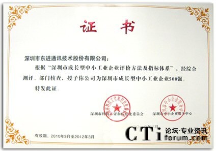 CTI論壇(ctiforum)4月6日消息(記者 潘婷婷):由深圳市政府大力支持,深圳市科工貿(mào)信委、深圳市中小企業(yè)服務(wù)中心,深圳市統(tǒng)計(jì)局,深圳大學(xué)管理學(xué)院聯(lián)合組織評(píng)測(cè)的“深圳市成長(zhǎng)型中小工業(yè)企業(yè)500強(qiáng)”,于3月31日被正式認(rèn)定,深圳市東進(jìn)通訊技術(shù)股份有限公司榮列其中。今后,作為深圳市中小企業(yè)成長(zhǎng)工程的重點(diǎn)培育對(duì)象,東進(jìn)技術(shù)將獲得政府公共資源的傾斜扶持,促進(jìn)加快發(fā)展,形成“示范效應(yīng)”。