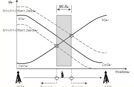 過早、過晚切換是由于目標(biāo)小區(qū)切換門限過低和過高所致。對應(yīng)過早和過晚臨界切換門限之間的區(qū)間就是合理的移動性優(yōu)化范圍。頻內(nèi)的負(fù)載均衡也可以通過調(diào)整切換門限值來引導(dǎo)用戶和負(fù)荷由高負(fù)荷小區(qū)遷移至低負(fù)荷小區(qū),很顯然可調(diào)的門限區(qū)間就是移動性優(yōu)化允許的范圍。這個范圍對應(yīng)相鄰小區(qū)的重覆蓋面積,在LTE中理論上大概相當(dāng)于正常小區(qū)面積的15%,可操作的價值不是很大。愛立信更傾向于異頻或者異系統(tǒng)的負(fù)荷均衡方案,增益比較明顯。如下圖,一個終端從左至右移動,M1、M2分別是接收到eNB1和eNB2的信號強(qiáng)度曲線,兩條曲線相交點對應(yīng)的地理位置處終端接收到的信號強(qiáng)度相同,對cell1到cell2的切換,下面的虛線對應(yīng)過早切換臨界,上面的虛線對應(yīng)過晚切換臨界,兩線與M2相交點對應(yīng)合理切換門限區(qū)間,也是頻內(nèi)負(fù)載均衡MLB的可調(diào)范圍。