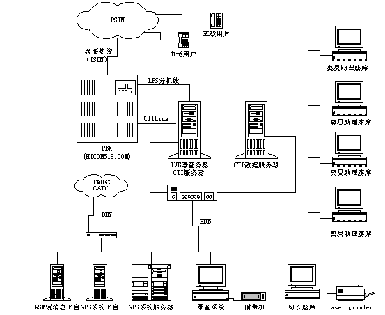 在整個(gè)系統(tǒng)中北京聯(lián)訊創(chuàng)新公司承擔(dān)了奧星天網(wǎng)GPS信息服務(wù)系統(tǒng)的呼叫中心系統(tǒng)(CALL CENTER)的籌建。