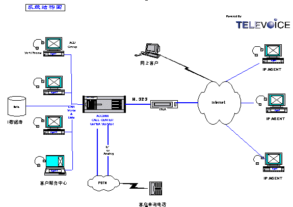 ACC2000通過H.323協(xié)議連接Internet,遠程人員在任何位置(使用配備聲卡和耳麥的PC)只要登錄Internet即可實現(xiàn)遠程座席功能.