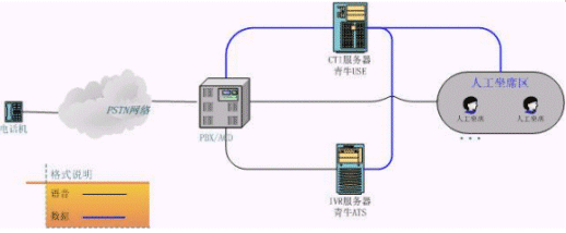上圖是客服中心較常見的結構圖,相當于將初級客服的CT-Server服務器一分為三。原來的語音板卡由現(xiàn)在真正的PBX替代,青牛USE和青牛ATS則是從CT-Server軟件包中獨立出來,強化各自的核心功能,運行在兩臺單獨的服務器上(IVR服務器還是需要語音板卡來處理話路,但語音板卡已經(jīng)不負責PBX的交換功能了)。這種類型的客服中心可以給客戶更大規(guī)模的、更穩(wěn)定的服務,并且撥入電話的客戶感覺不到系統(tǒng)的變化。