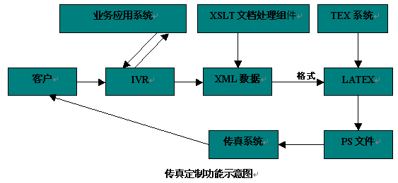 用戶通過IVR與業(yè)務(wù)應(yīng)用系統(tǒng)交互,獲得所需的傳真數(shù)據(jù),這些傳真數(shù)據(jù)在系統(tǒng)中以XML數(shù)據(jù)的格式存在,系統(tǒng)然后調(diào)用XSLT(英文縮寫,XSLT是語言,專門處理XML數(shù)據(jù),通過一段XSLT程序可以將XML數(shù)據(jù)轉(zhuǎn)換成其他的形式的文檔,如HTML,LATEX文檔,從而用來顯示XML數(shù)據(jù)給人們閱讀)文檔處理組件對XML數(shù)據(jù)處理,處理結(jié)果是LATEX(LATEX是TEX系統(tǒng)增加了一些宏指令的增強(qiáng),TEX系統(tǒng)是一個(gè)計(jì)算機(jī)排版系統(tǒng),