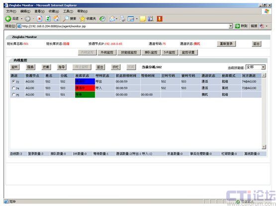 3.模塊界面劃分清晰:Monitor監(jiān)控模塊分為內(nèi)線監(jiān)控、外線監(jiān)控、虛通道監(jiān)控、技能組監(jiān)控和IVR監(jiān)控共五大類。各類別功能獨(dú)立運(yùn)行,可根據(jù)企業(yè)對聯(lián)絡(luò)中心班長的職責(zé)劃分,對各類技能組、項(xiàng)目組的班長登錄提供有區(qū)別的監(jiān)控頁面,從而為每位班長的恪盡職守提供了良好的保證。