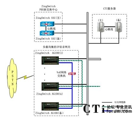 同時(shí)基于ZingSwitch® CVNET平臺(tái)的系統(tǒng)網(wǎng)絡(luò)架構(gòu)中,AG100(IP語(yǔ)音網(wǎng)關(guān))自身具有99.999%的高穩(wěn)定性外,具有負(fù)載均衡能力保證語(yǔ)音接續(xù)的不中斷。