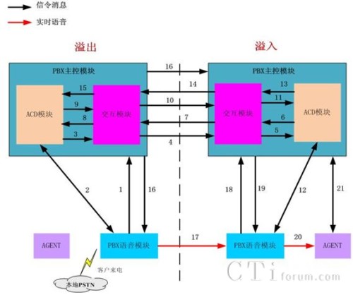 通過PBX/ACD建立一種電話路由共享和語(yǔ)音溢出的方法,實(shí)現(xiàn)多套聯(lián)絡(luò)中心平臺(tái)之間語(yǔ)音的動(dòng)態(tài)互溢,透明地為客戶提供優(yōu)質(zhì)、及時(shí)的電話服務(wù),客戶感覺不到任何差異。通過PBX/ACD建立一種電話路由共享和語(yǔ)音溢出的方法,作為行業(yè)現(xiàn)有實(shí)現(xiàn)方法的有效補(bǔ)充,解決了行業(yè)現(xiàn)有實(shí)現(xiàn)方法的無法實(shí)現(xiàn)最短路徑溢出問題,通過ACD的“先排隊(duì)后進(jìn)門”的預(yù)約預(yù)定模式,動(dòng)態(tài)判斷彼此的運(yùn)行狀態(tài)和處理能力,無需先將語(yǔ)音溢出到另外一個(gè)聯(lián)絡(luò)中心,只有當(dāng)另外一個(gè)聯(lián)絡(luò)中心確定能提供相應(yīng)的語(yǔ)音服務(wù)和人工服務(wù)的時(shí)候,語(yǔ)音才在PBX語(yǔ)音層面通過標(biāo)準(zhǔn)通信協(xié)議進(jìn)行互聯(lián)互通,避免實(shí)時(shí)語(yǔ)音被多次溢出,實(shí)時(shí)實(shí)時(shí)語(yǔ)音溢出只走最短路徑,保證客戶電話只需一次溢出就能立即提供語(yǔ)音服務(wù)和人工服務(wù),大幅減少了語(yǔ)音溢出的處理時(shí)間,同時(shí)也大幅減少了語(yǔ)音處理次數(shù),提升了系統(tǒng)處理性能。