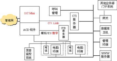 本方案的主要應用平臺包括:Meridian 1 Option 11 mini ISDN數(shù)字程控交換機(配ACD軟件包)、交互式語音應答系統(tǒng)(IVR)、計算機電話集成系統(tǒng)(CTI)、座席、呼叫管理系統(tǒng)、錄音監(jiān)控系統(tǒng)、數(shù)據(jù)庫服務器、應用網(wǎng)關、WWW服務器、網(wǎng)絡系統(tǒng),其邏輯結構下圖所示。