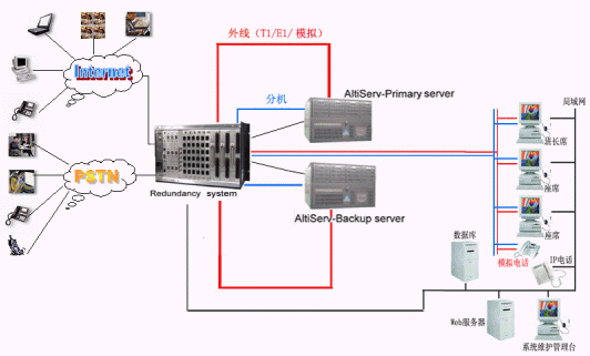 奧迪堅通訊系統(tǒng)有限公司作為CTI通訊平臺的提供商,在技術(shù)上不斷創(chuàng)新,對產(chǎn)品精益求精,尤其體現(xiàn)在對系統(tǒng)的運(yùn)行安全性的要求上,為了防止電信接入設(shè)備或者企業(yè)網(wǎng)絡(luò)出現(xiàn)故障而造成的呼叫中心服務(wù)中斷,奧迪堅呼叫中心系統(tǒng)提供安全保護(hù)冗余切換系統(tǒng),來保障呼叫中心在意外情況下的正常工作,該安全冗余切換系統(tǒng)通過對電源、T1/E1、模擬trunk、分機(jī)座席、以及各種網(wǎng)絡(luò)鏈路串口等備份切換來實(shí)現(xiàn)可靠的運(yùn)行。除此之外,奧迪堅系統(tǒng)本身也提供強(qiáng)大的安全保障,由于采用先進(jìn)IP內(nèi)核一體化設(shè)計,集傳統(tǒng)PBX、CTI服務(wù)器、IVR、ACD、Recording、FAX等眾多設(shè)備于一體,這樣有效的避免了因為外掛設(shè)備過多以及設(shè)備供應(yīng)商的不同而存在的兼容性的問題,從而降低了給呼叫中心系統(tǒng)帶來的的不穩(wěn)定的安全隱患。在系統(tǒng)之外依靠安全保護(hù)冗余切換系統(tǒng),可以實(shí)現(xiàn)外線、分機(jī)、以及各種鏈路接口的雙倍安全運(yùn)行。如上圖所示:兩臺奧迪堅的呼叫中心服務(wù)器和奧迪堅安全冗余切換系統(tǒng)構(gòu)成呼叫中心熱備份系統(tǒng),在兩臺服務(wù)器中安裝所有的呼叫中心功能模塊。通常情況下由主呼叫中心服務(wù)器提供系統(tǒng)的正常運(yùn)行,備份服務(wù)器通過安全保護(hù)冗余切換系統(tǒng)的服務(wù)監(jiān)測模塊來監(jiān)測主服務(wù)器的各項設(shè)備和鏈路的使用情況,當(dāng)主服務(wù)器遭遇突發(fā)故障不能繼續(xù)工作時,系統(tǒng)馬上實(shí)施自動切換,就會通過安全保護(hù)冗余切換系統(tǒng)將系統(tǒng)切換到備份的呼叫中心系統(tǒng)上來,此鏈路可以是數(shù)據(jù)、語音、網(wǎng)絡(luò)、串口等。當(dāng)安全保護(hù)冗余切換系統(tǒng)自身出現(xiàn)斷電或者其他故障時,所有鏈路均保持正常工作狀態(tài)。
