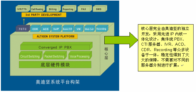 值得一提的是,在穩(wěn)定性上,奧迪堅(jiān)IP一體化呼叫中心平臺系統(tǒng)構(gòu)架,從產(chǎn)品設(shè)計(jì)之初就突破了以住基于交換機(jī)或板卡的傳統(tǒng)模式,在一臺通訊服務(wù)器上高度融合了呼叫中心的所有常用功能,有效避免了復(fù)雜的網(wǎng)絡(luò)連接和眾多的各類交換機(jī)和外掛設(shè)備,各個(gè)設(shè)備相對獨(dú)立兼容性差所給呼叫中心系統(tǒng)所帶的穩(wěn)定性欠佳的隱患。除此之外,奧迪堅(jiān)呼叫中心系統(tǒng)底層硬件模塊是在美國設(shè)計(jì)生產(chǎn)的,通過北美和中國的嚴(yán)格的電信入網(wǎng)測試;相對于硬件,平臺軟件也都是由奧迪堅(jiān)自主開發(fā)設(shè)計(jì)的,針對不同的硬件采用不同的驅(qū)動模塊,軟硬一體在交換層又使用統(tǒng)一的邏輯接口,結(jié)構(gòu)清晰,層次合理,不僅保障了穩(wěn)定而且便于擴(kuò)展(如下圖所示),整個(gè)系統(tǒng)作為一個(gè)整體統(tǒng)一擴(kuò)展,不需要對不同的服務(wù)器分別進(jìn)行擴(kuò)展,有效避免了傳統(tǒng)呼叫中心構(gòu)建方式在擴(kuò)展方面存在的復(fù)雜性問題以及高額的擴(kuò)展費(fèi)用。