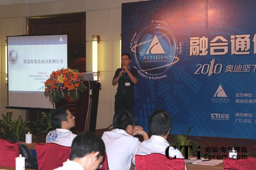 與會(huì)期間,奧迪堅(jiān)大區(qū)銷(xiāo)售總監(jiān)廖澄和奧迪堅(jiān)技術(shù)總監(jiān)強(qiáng)雄飛發(fā)表了“下一代融合型通信平臺(tái)介紹”、“ 下一代呼叫中心解決方案介紹”以及“奧迪堅(jiān)全系列自主融合通信產(chǎn)品介紹”主題演講。