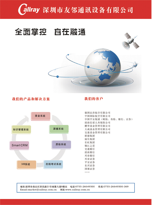 深圳市友鄰?fù)ㄓ嵲O(shè)備有限公司是一家以通訊軟件開發(fā)為主的高科技企業(yè)。主要產(chǎn)品AP Suite是基于呼叫中心的工作質(zhì)量管理系統(tǒng)和軟件,自1997年進行產(chǎn)品開發(fā)和市場開拓以來,AP Suite呼叫中心質(zhì)量管理軟件日趨完善,得到廣大行業(yè)客戶的一致認同和好評。到目前為止,該系統(tǒng)已成功應(yīng)用于民航、金融、保險、證券、電信、公安、電力以及政府等多種行業(yè)、部門。