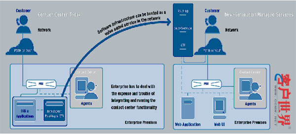 例如新建的呼叫中心可以采用全部部件托管的模式來。已建的呼叫中心可以將部分的部件交付托管,或者新增的呼叫中心點采用托管來與既有的點聯(lián)網(wǎng)形成虛擬的呼叫中心。
