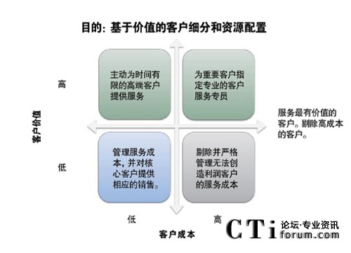 現(xiàn)實情況是,許多采取該策略的公司都僅將基于價值的客戶細(xì)分應(yīng)用于高價值、高成本的客戶,而不是應(yīng)用于已有客戶的絕大部分。這是一種不可持續(xù)的商業(yè)行為。然而,許多公司之所以這樣做,是因為公司在所有的客戶細(xì)分領(lǐng)域,無視價值高低,不加區(qū)分的投入成本和服務(wù),會存在風(fēng)險,即讓服務(wù)更多的投入到價值不高,卻又經(jīng)常呼入的客戶上,從而忽視了一些更有