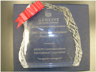 在2006年8月結(jié)束的澳洲墨爾本G-Force會議上,Genesys將 “2005年亞太地區(qū)最佳市場拓展”(2005 Market Development Award,APAC)獎項授予億迅,億迅總裁李冰影女士出席頒獎儀式并代表公司領(lǐng)取該獎。