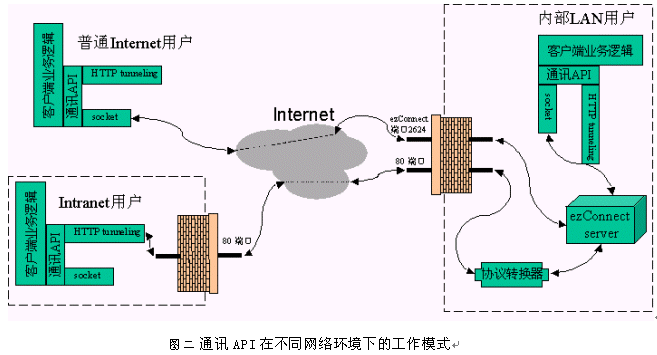 對于被企業(yè)防火墻所限制的Intranet用戶,情況略微復(fù)雜一些。如果企業(yè)防火墻已開放ezConnect的協(xié)議端口2624,那么此類Intranet用戶訪問ezConnect系統(tǒng)的情況與普通Internet用戶沒有區(qū)別。如果企業(yè)防火墻限制ezConnect的協(xié)議端口,但允許HTTP協(xié)議通過,那么上文中提到的API會自動選用HTTP隧道的通信方式來維護(hù)客戶端軟件與服務(wù)器軟件之間的連接。此時,通信的效率會相對低一些,但對于可以透明地、完整地獲取Internet呼叫中心服務(wù)(文本交談、白板共享、IP電話等)的Intranet用戶來講是完全可以接受的。如果企業(yè)防火墻同時禁止ezConnect的協(xié)議端口2624和HTTP協(xié)議的默認(rèn)端口80,Intranet用戶將無法訪問ezConnect系統(tǒng)。而事實上,嚴(yán)格到不允許HTTP協(xié)議通過的防火墻是非常少見的,因此目標(biāo)4也不成為問題。