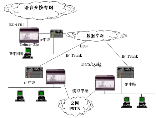 隨著IP網(wǎng)絡(luò)技術(shù)的不斷發(fā)展,數(shù)據(jù)網(wǎng)絡(luò)的融合能力越來越強(qiáng)。AVAYA在全球范圍內(nèi)率先推出全面符合H.323標(biāo)準(zhǔn)的VoIP解決方案及基于IP中繼的DCS/Q.sig專網(wǎng)透明功能信令。通過IP中繼將公司全部分支包括機(jī)構(gòu)的DEFINITY交換機(jī)進(jìn)行連接,同樣可以提供全面的專網(wǎng)透明功能和網(wǎng)絡(luò)呼叫中心應(yīng)用,DEFINITY IP中繼可提供豐富的語音壓縮能力,從64Kbps的無壓縮傳輸?shù)?Kbps的經(jīng)濟(jì)傳輸方案均可提供,同時通過復(fù)用在IP包中的DCS/Q.sig信令提供透明功能。