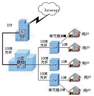 寬帶小區(qū)網(wǎng)絡(luò)建設(shè)采用基于三層交換的千兆以太技術(shù),在小區(qū)核心引入帶光口的千兆以太網(wǎng)交換機,通過光纖以千兆速率上連至ISP接入?yún)^(qū)域交換機。小區(qū)內(nèi)部形成星型結(jié)構(gòu),每棟單元樓內(nèi)放置帶百兆光口的以太網(wǎng)交換機,通過百兆光纖將小區(qū)核心和單元樓連接起來。樓宇內(nèi)部布放五類線,連至用戶計算機的網(wǎng)卡,使最終用戶上網(wǎng)速率達(dá)到10M或更高。