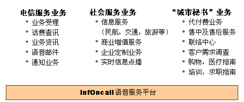 InfOnCall語音服務平臺應用于電信服務業(yè),能為運營商提供相當廣的業(yè)務范圍。