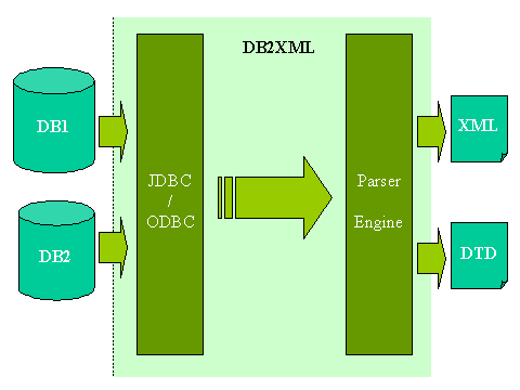 DB2XML中通過JDBC或JDBC-ODBC橋接各種現(xiàn)存的數(shù)據(jù)庫,訪問數(shù)據(jù)庫中的表;通過XML parser構(gòu)造出代表數(shù)據(jù)庫內(nèi)容的XML文件。DTD文件描述了從數(shù)據(jù)庫中的表到XML文件的對應關系。上圖描述了DB2XML的輸入輸出關系。事實上DB2XML是按照以下步驟完成轉(zhuǎn)化工作的: