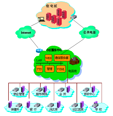 以國際標(biāo)準(zhǔn)的VXMLl技術(shù)為主導(dǎo)的小區(qū)服務(wù)中心系統(tǒng)可以與互聯(lián)網(wǎng)輕易地連通,從而為小區(qū)的服務(wù)網(wǎng)點走出小區(qū)的地域限制做好技術(shù)上的儲備。vxml的易開發(fā)和易擴展性,使得遠(yuǎn)程服務(wù)的增加,幾乎不需要任何成本的追加,任何第三方服務(wù)提供者具備vxml業(yè)務(wù),都可以直接掛到服務(wù)中心上來。