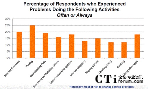 調(diào)查顯示,超過(guò)2/3的美國(guó)智能手機(jī)用戶從事一些最常見(jiàn)的活動(dòng)時(shí),遭遇了網(wǎng)絡(luò)服務(wù)問(wèn)題,包括互聯(lián)網(wǎng)搜索、數(shù)據(jù)下載、搜尋或觀看視頻和社交網(wǎng)絡(luò)。此外,在調(diào)查中發(fā)現(xiàn),當(dāng)他們遇到服務(wù)和中斷問(wèn)題時(shí),消費(fèi)者把責(zé)任歸罪于他們的移動(dòng)網(wǎng)絡(luò)運(yùn)營(yíng)商商(MNO)。事實(shí)上,幾乎所有被調(diào)查的智能手機(jī)用戶的一半,由于他們的體驗(yàn)問(wèn)題抱怨他們的移動(dòng)網(wǎng)絡(luò)運(yùn)營(yíng)商商(MNO)。