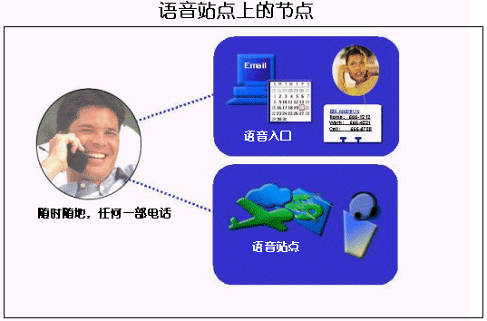在語音網(wǎng)上,內(nèi)容和服務(wù)將會(huì)以兩種方式出現(xiàn)即個(gè)人語音站點(diǎn)和語音入口。語音入口和語音站點(diǎn)都屬于網(wǎng)絡(luò)上的節(jié)點(diǎn),這兩者由一個(gè)標(biāo)準(zhǔn)的語音瀏覽器連接起來,關(guān)于這部分內(nèi)容,將在以后進(jìn)行描述。