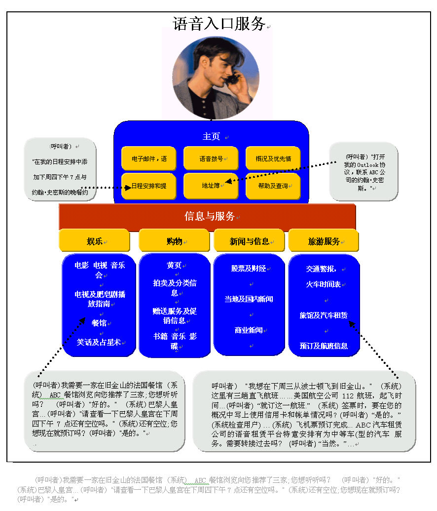 語音網(wǎng)最吸引人之處就在于它可以在一次通話中,同時(shí)處理多個(gè)任務(wù)。下圖表明一名商務(wù)人員是如何安排好與一個(gè)未來的商務(wù)旅行有關(guān)的一系列任務(wù)的。他獲取了對(duì)自己有用的信息,順利達(dá)成了一項(xiàng)語音商務(wù)交易,接收個(gè)人信息和辦公室的幫助,并撥打電話所有這些都是在一個(gè)同步過程中完成的。