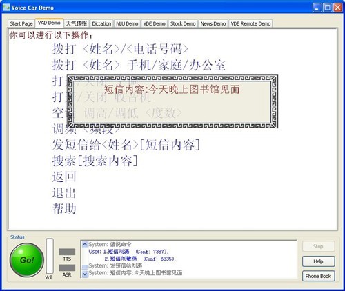 Nuance:可以修改。到你需要修改的那個(gè)“見”上,你再說(shuō)“見”或者見面,它就給你弄過(guò)來(lái)了。但是我們覺(jué)得在中國(guó)區(qū),在中文的修改上,這未必可能是個(gè)好辦法,我們也在試探另外一種辦法,這個(gè)辦法我現(xiàn)在可以給大家介紹一下。就是這樣,我要說(shuō)修改,那么那個(gè)語(yǔ)音合成TS就開始給你再讀,剛才不是讀了一遍嗎,它再給你讀,但是這一次讀,它是一個(gè)詞一個(gè)詞地讀。他說(shuō),今天我不吭聲,晚上,我不吭聲,他說(shuō)七點(diǎn),我也不吭聲,等他說(shuō)“見”的時(shí)候,我說(shuō)“見面”,他知道我說(shuō)的這個(gè)詞要把那個(gè)覆蓋掉,再改,再把它改了。這樣可能更合理一些,就是你手不用去摸什么東西,眼睛看什么東西,完全能保持你在駕駛的時(shí)候,這是我們目前還在進(jìn)行開發(fā)的一個(gè)東西,或許下一次如果我們?cè)儆袡C(jī)會(huì)我們就可以把這個(gè)演示一下。