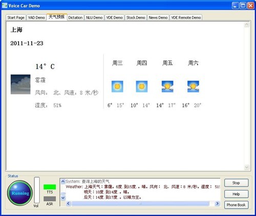 比方說(shuō)這個(gè)關(guān)于空調(diào)問(wèn)題,我們過(guò)去,空調(diào)的命令詞是“把空調(diào)打開,空調(diào)溫度提高3度!爆F(xiàn)在我也可以這樣說(shuō),空調(diào)調(diào)高一點(diǎn),我有點(diǎn)冷,也可以。就是你在車?yán)镞呁耆梢杂媚阕约旱恼Z(yǔ)言來(lái)說(shuō)你想干的事。比如說(shuō),前邊你不知道明天天氣會(huì)怎么樣,人一般都會(huì)想想,明天天氣如何,或者是告訴我天氣預(yù)報(bào)。但是你也可以這樣說(shuō)。明天會(huì)下雨嗎?也可以這樣說(shuō);蛘吣氵@樣說(shuō),你說(shuō),今天大盤怎么樣。完全是用自然語(yǔ)言來(lái)說(shuō)。堵不堵車,“查詢交通情況!边@就是,實(shí)際上可以有各種不同的說(shuō)法來(lái)完成這個(gè)任務(wù),這是我們自然語(yǔ)言的一個(gè)演示。