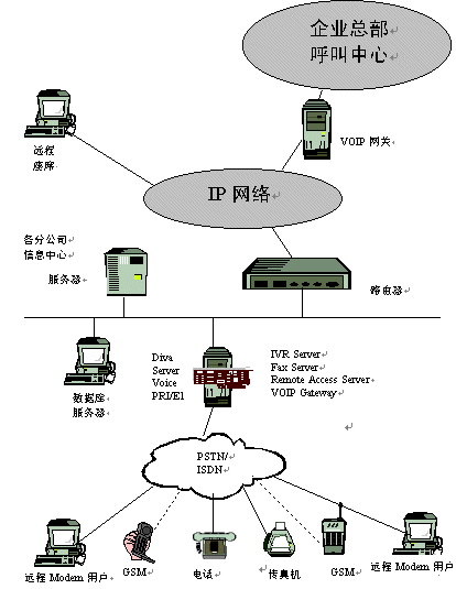 隨著信息技術的發(fā)展,企業(yè)對通訊的需求越來越多,并越來越呈現(xiàn)多樣性,有語音通訊,傳真通訊,數(shù)據通訊等。我們拿銀行作為一個例子來分析,目前我國大多數(shù)大型商業(yè)銀行都在各個市(甚至縣)建有一個IVR交互式語音應答系統(tǒng)以滿足其客戶的語音查詢需求;同時,系統(tǒng)也要具備傳真通訊功能,以滿足某些大客戶需要傳真回復確認的需求;目前,各個商業(yè)銀行也建立了自己的企業(yè)銀行平臺,所以中心也需構建一個接入服務器來滿足某些大客戶的遠程撥號接入進行遠程交易;隨著Call center 應用的興起,各商業(yè)銀行的省行呼叫中心需要將其各市行的語音接入平臺(IVR),通過VoIP 技術,接入到省行的Call Center 中心,從而建立一個分布式的Call Center,以提高對其客戶服務的滿意度 。