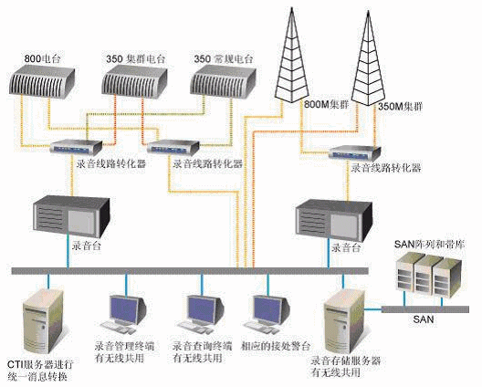 系統(tǒng)對(duì)無(wú)線通訊部分的800M TETRA集群、350M模擬集群、TETRA基地臺(tái)、350M常規(guī)基地臺(tái)、350M集群電臺(tái)等進(jìn)行錄音。