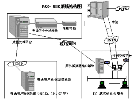 為了滿足各類社會應急與服務呼叫系統(tǒng)對電話用戶資料的需要,同時又解決電信部門對用戶資料數(shù)據(jù)庫的保密和安全要求,我公司成功開發(fā)了PAS-UDE(User Data Extract)電話信息回送系統(tǒng),并成為110聯(lián)網(wǎng)接口設備開發(fā)生產(chǎn)入網(wǎng)廠商。
