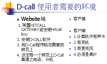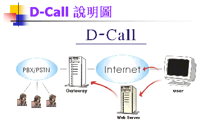 D-CALL指的是”Direct Call on Web”,提供電子商務(wù)中客戶與企業(yè)間網(wǎng)上實(shí)現(xiàn)網(wǎng)上實(shí)時(shí)語音互動(dòng)平臺(tái)。