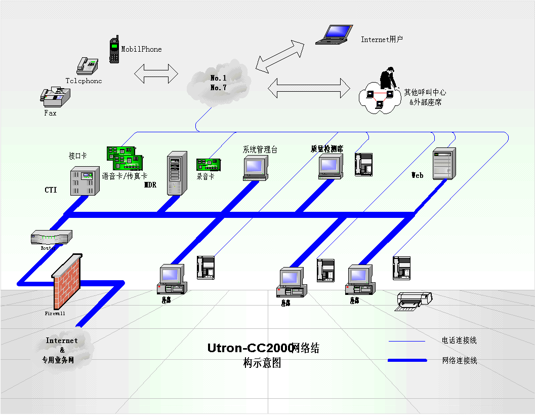 。。Utron-CC2000呼叫中心平臺是一個集語音技術(shù)、通信技術(shù)、計算機網(wǎng)絡(luò)、數(shù)據(jù)庫技術(shù)于一體,基于分布式對象提供的全方位綜合信息,支持傳統(tǒng)電話、傳真、電子郵件、Web等多種媒體接入方式的呼叫智能響應(yīng)中心。