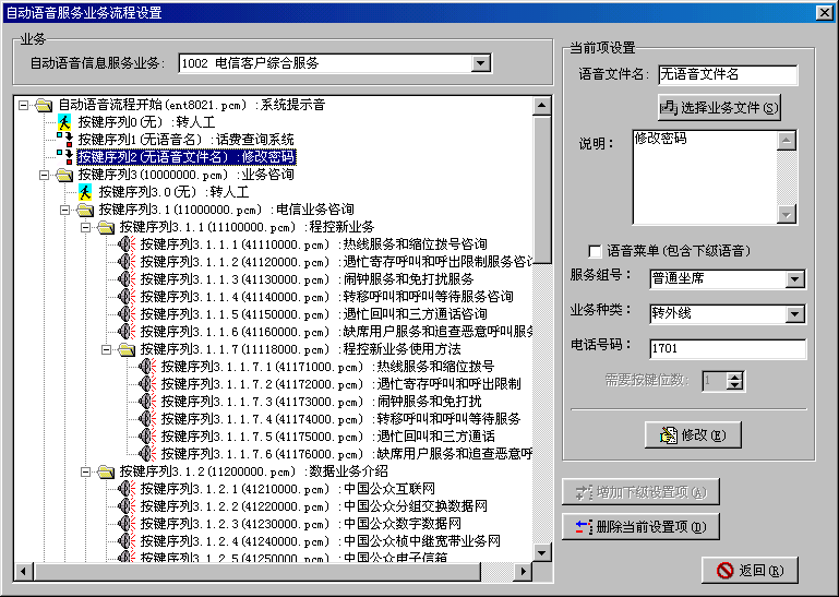 。。智能業(yè)務(wù)管理系統(tǒng)是Utron-CC2000進行業(yè)務(wù)擴充的主要手段。用戶如需擴展新的業(yè)務(wù),主要通過智能業(yè)務(wù)管理系統(tǒng)向Utron-CC2000注冊該業(yè)務(wù);并為系統(tǒng)中的座席分配業(yè)務(wù)。根據(jù)實際業(yè)務(wù)的需求,生成相應(yīng)的系統(tǒng)信箱、業(yè)務(wù)腳本、服務(wù)項目等,來實現(xiàn)新業(yè)務(wù)的動態(tài)加載。
