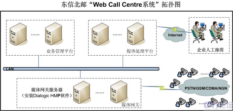 隨著中國經(jīng)濟(jì)的快速發(fā)展,越來越多的企業(yè)尤其是中小企業(yè)對(duì)呼叫中心的需求量越來越大,需求質(zhì)量也越來越高。由于呼叫中心建設(shè)涉及技術(shù)十分專業(yè)、涉及領(lǐng)域也比較廣泛、必須投入巨大的資金購買軟硬件設(shè)備,并且需要大量的維護(hù)力量,因此對(duì)于中小企業(yè),尤其是缺乏專業(yè)技術(shù)力量和資金的中小企業(yè)來說,建設(shè)自有的呼叫中心顯得不切實(shí)際。正是基于這種情況,EB開始與Dialogic合作,采用其HMP系統(tǒng)軟件,以IP技術(shù)為基礎(chǔ),依托電信網(wǎng)絡(luò),建設(shè)呼叫中心系統(tǒng),以托管方式為客戶提供呼叫中心服務(wù),即Web Call Centre服務(wù)。