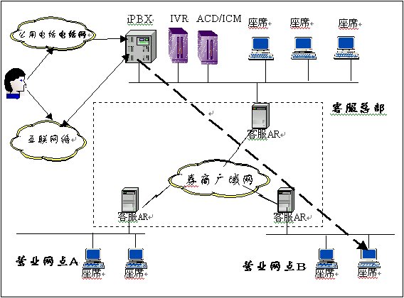 在總部設立集中的客戶服務中心完成對全網(wǎng)的人工座席的管理和調(diào)度,由總部的ACD完成對全網(wǎng)人工業(yè)務的呼叫分配,借助廣域網(wǎng)絡,實現(xiàn)話務在區(qū)域范圍內(nèi)的接續(xù)。在座席配置上既可以采用集中配置,各營業(yè)部分散配置專家座席的方式。