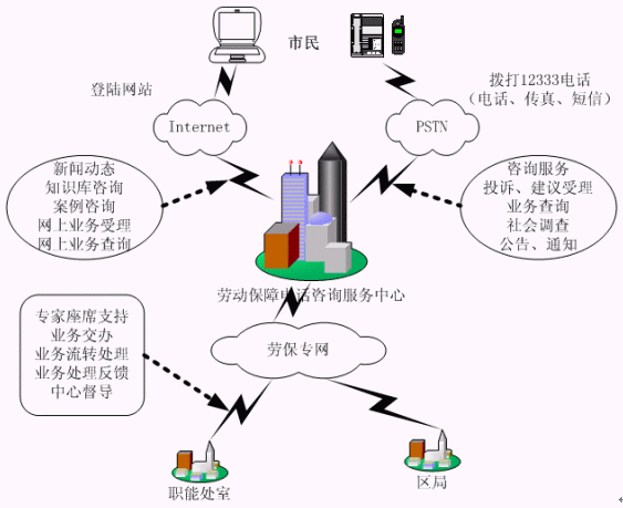 合肥市12333電話咨詢服務(wù)系統(tǒng)的建設(shè),使勞動和社會保障業(yè)務(wù)延伸到市民、企業(yè)的身邊。克服地域和時間的限制,實現(xiàn)了每天24小時不間斷地隨時提供服務(wù)。該系統(tǒng)的建設(shè)將原本分散在各部門的對外服務(wù)業(yè)務(wù)內(nèi)容,集中在一個統(tǒng)一的對外服務(wù)"窗口",并與就業(yè)、失業(yè)、養(yǎng)老、醫(yī)療、生育及勞動關(guān)系等管理系統(tǒng)建立接口,實現(xiàn)資源共享,為勞動者提供包括電話、傳真、電子郵件、因特網(wǎng)等多種方式熱線咨詢服務(wù),從而架起勞動者與勞動部門之間密切聯(lián)系的橋梁,使廣大勞動群眾的權(quán)益真正落到了實處。樹立勞動和社會保障行業(yè)系統(tǒng)的良好服務(wù)形象。推動勞動保障局管理和服務(wù)的社會化,實行全面的標(biāo)準(zhǔn)化、規(guī)范化、制度化和網(wǎng)絡(luò)化的完善的服務(wù)。