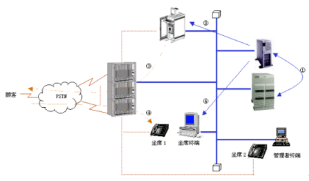④ 如果與顧客通話成功,則CIDS報(bào)告CTI服務(wù)器,CTI 服務(wù)器命令PBX將呼叫分配到當(dāng)前處于空閑的人工坐席,顧客信息將自動(dòng)彈出到坐席PC屏幕